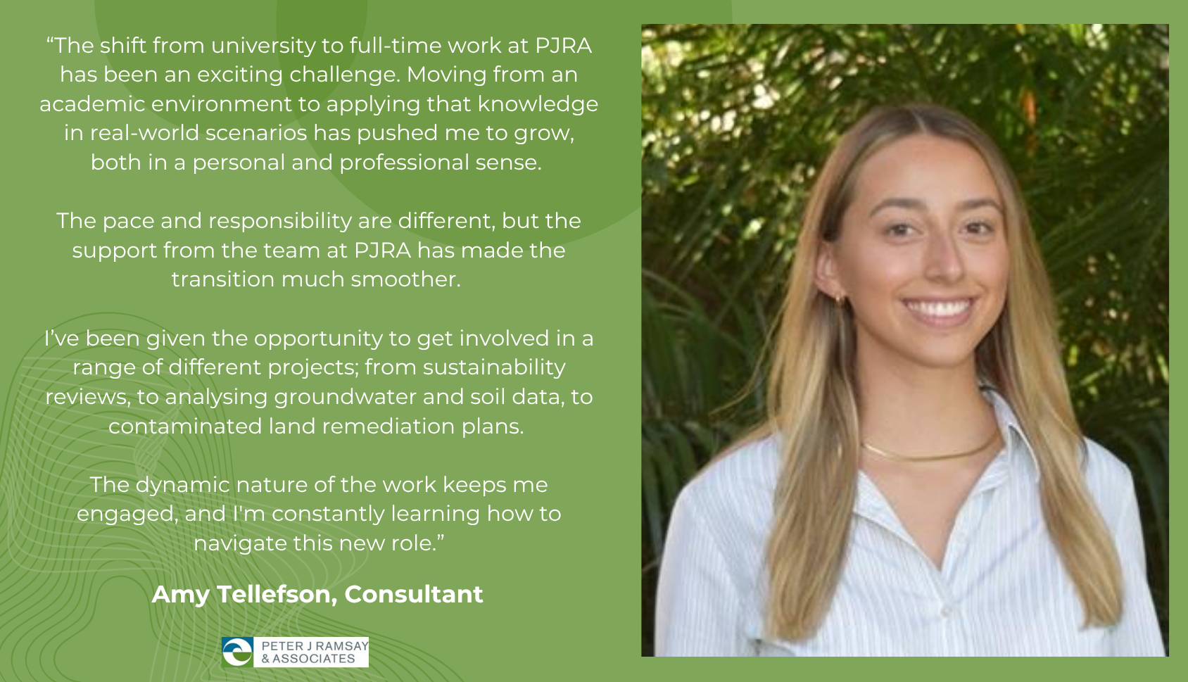 At PJRA, we are committed to supporting the next generation of environmental professionals. In 2025, we welcomed Amy and Zen — two passionate, driven graduates who have quickly become valuable members of our team.